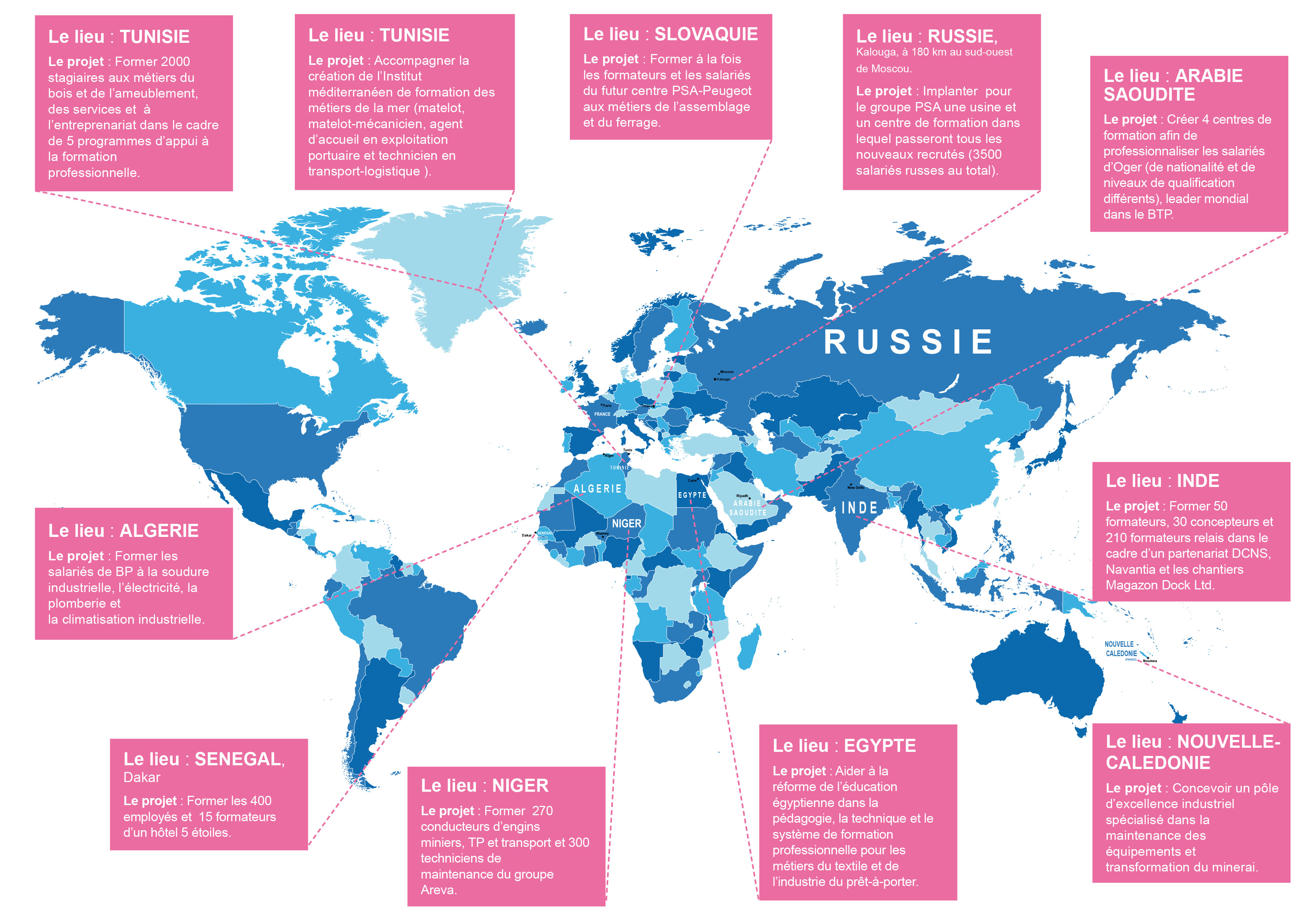Sénégal, Cameroun, Egypte, Maroc, Tunisie, Gabon, Arabie Saoudite, Russie, Macédoine, Pologne, Estonie, Vietnam …  nous intervenons depuis de nombreuses années, dans le cadre d’accords de coopération  bilatérales ou par appui à la conquête de marchés, en Afrique, Moyen-Orient, Asie et Europe .